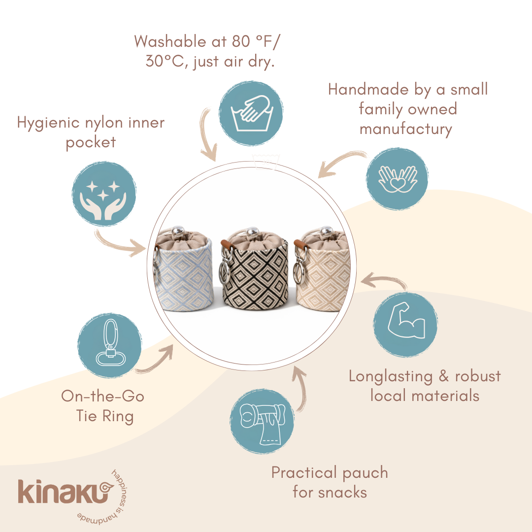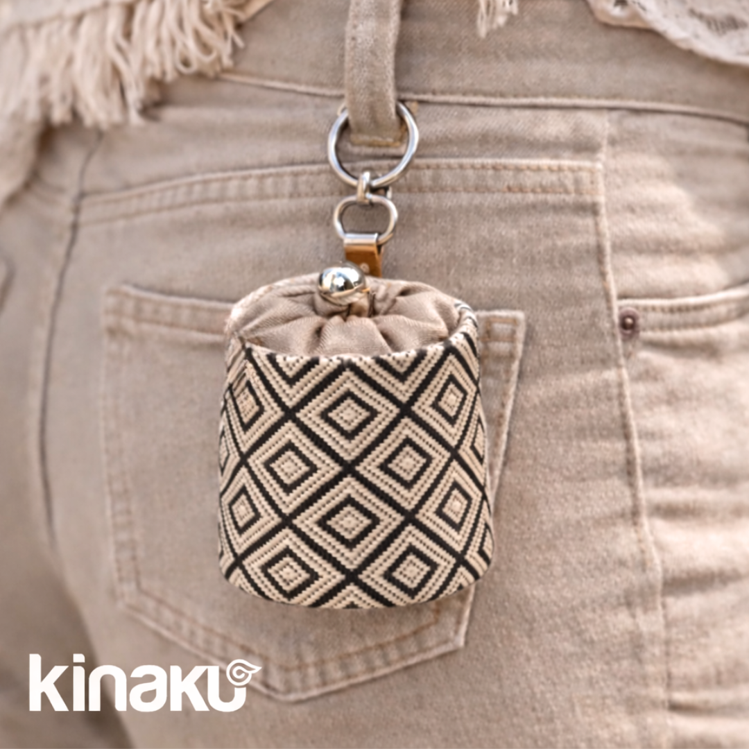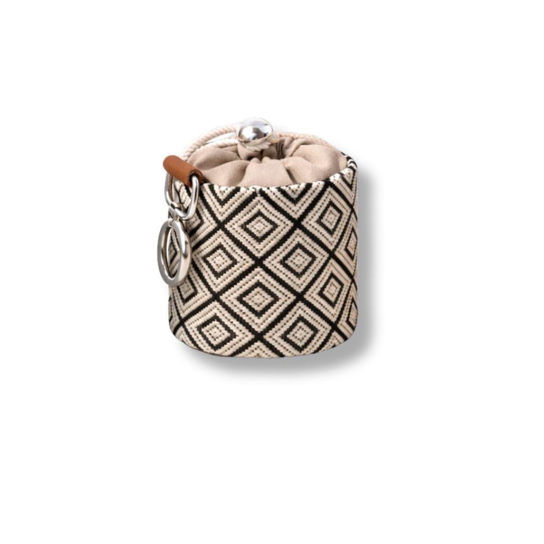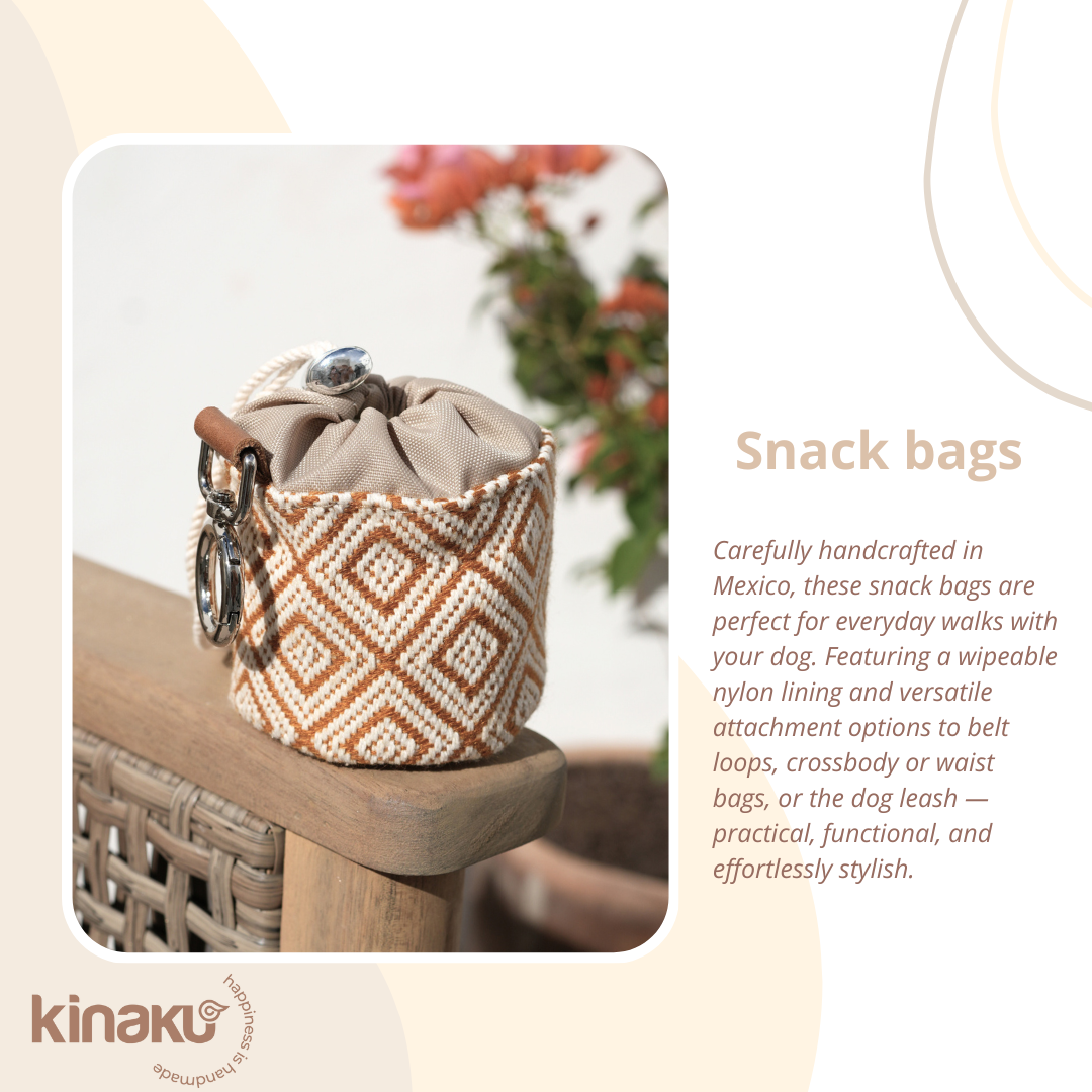 Handcrafted snack bag from Mexico with a wipeable nylon lining, easily attachable to belt loops, waist bags, or the dog leash — practical, stylish, and perfect for everyday walks with your dog.